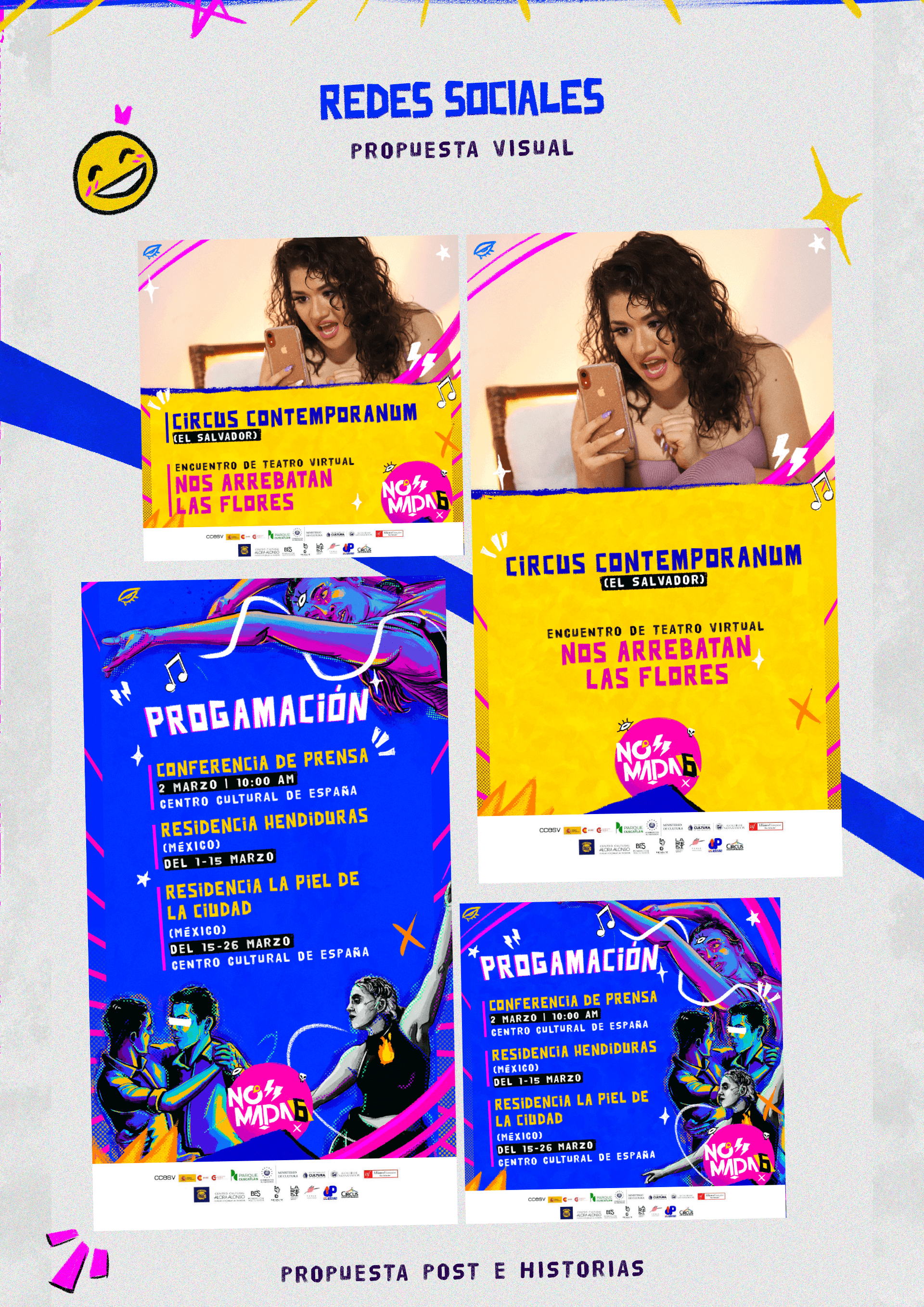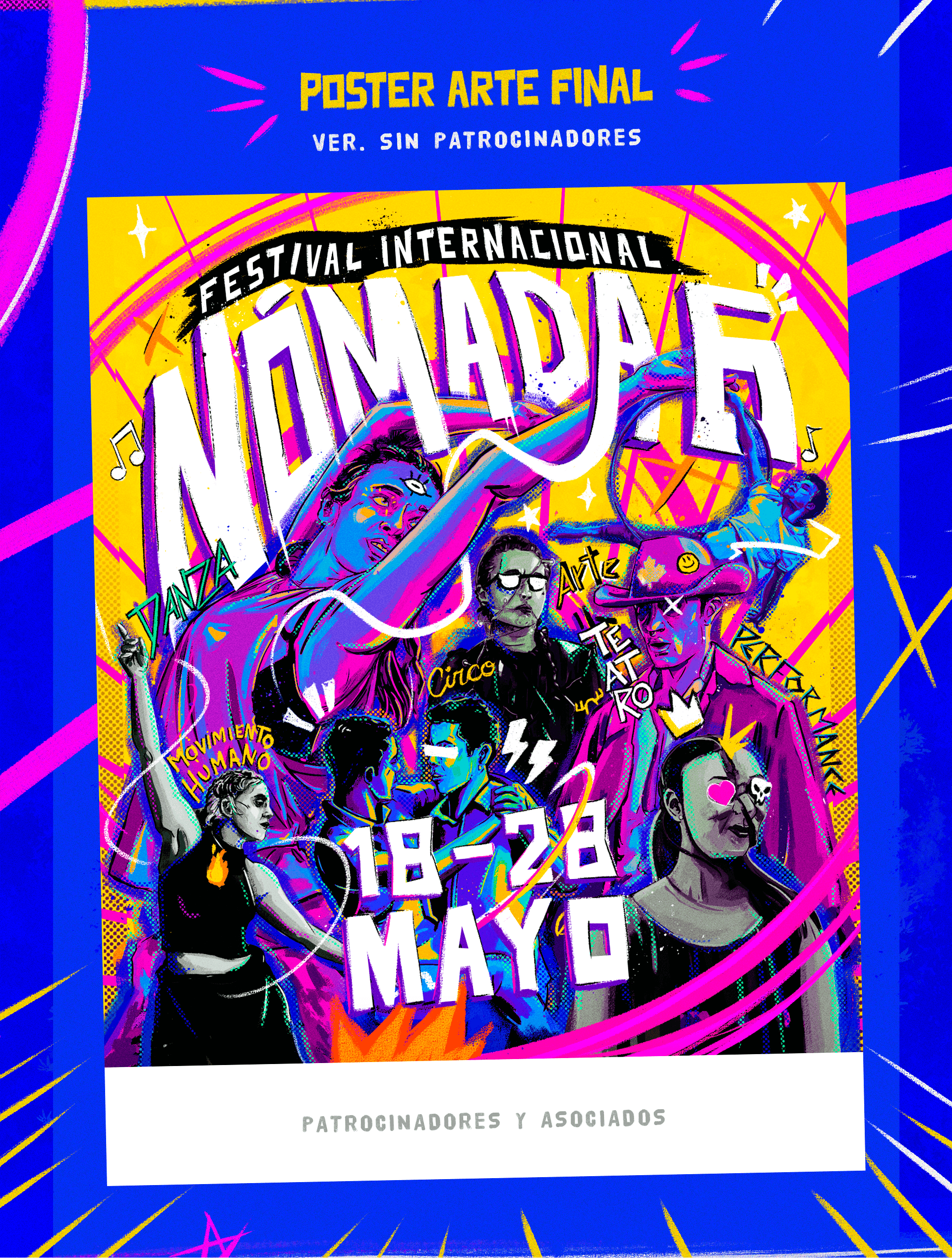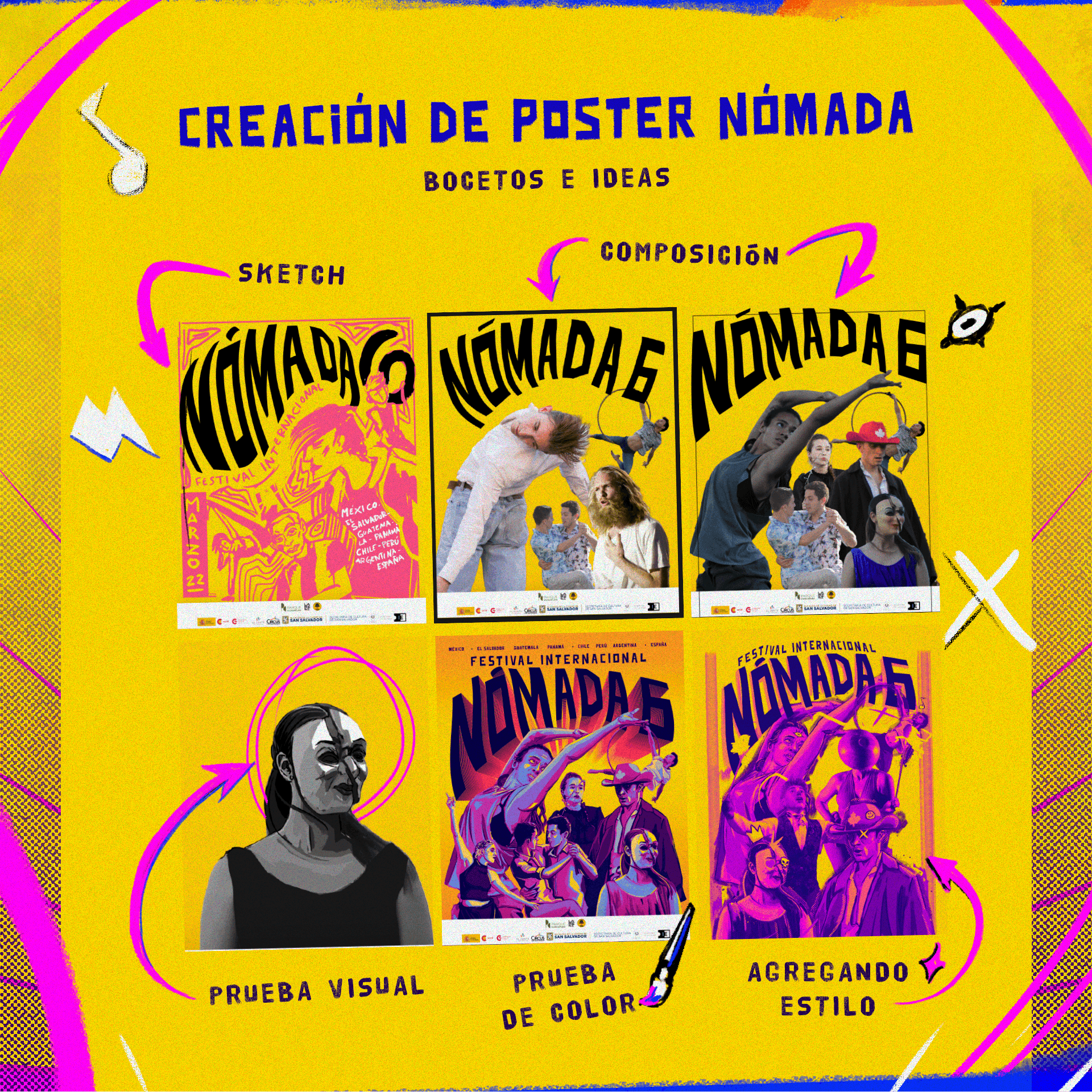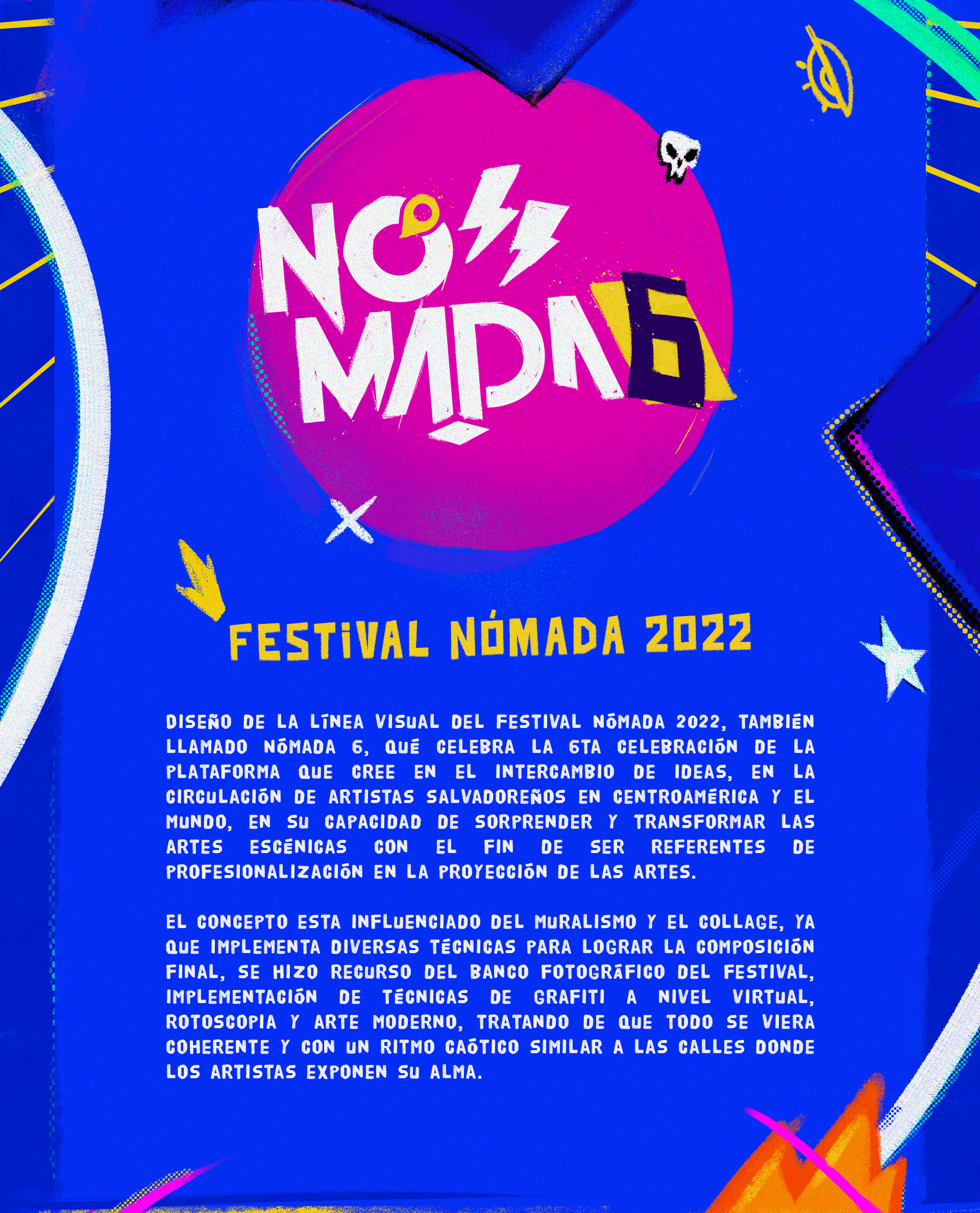 Key visual of the Festival Nómada 2022, also called Nómada 6, which celebrates the 6th celebration of the platform that believes in the exchange of ideas, in the circulation of Salvadoran artists in Central America and the world, in their ability to surprise and transform the performing arts to be referents of professionalization in the projection of the arts.